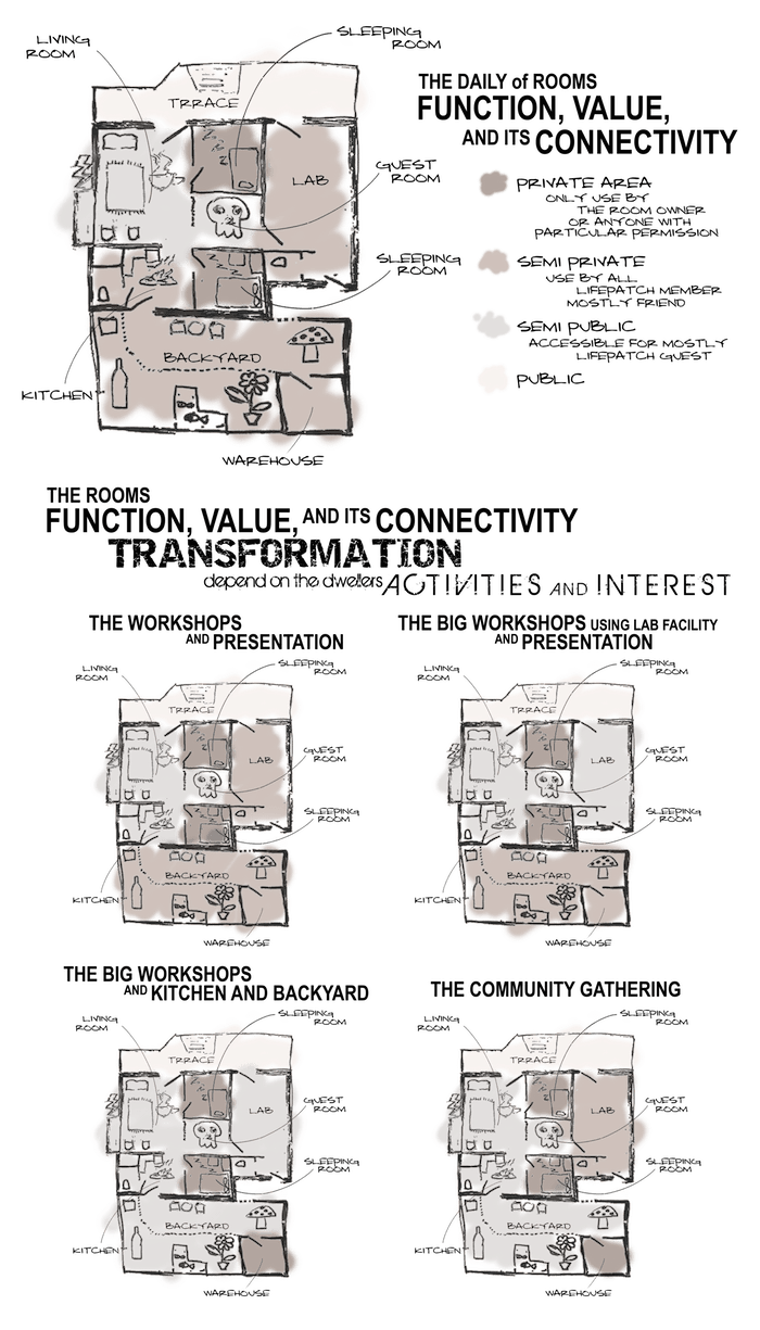When examining thoroughly to presents the works and all activities of Lifepatch, there seems to be a tendency to put The Rumah as The main space to work and interact cooperatively with individuals and communities. As a space of collective community-based, Rumah of Lifepatch also represents its dweller’s strategy as a collective when practising their methods of dwelling in a place where private and public as place values and function can be connected or separated. The first part that also being called “Rumah” is the main area with private value and protected by a particular structure of a building. Basically, Rumah is the representative of its dweller’s internal affairs, which is an organic space that always growing and slightly changing based on the dweller’s effort to organize, compromise, and collaborate with each other to meet all their basic needs, interests, and activities. The second part called the “Halaman” or the courtyard. This part is a transition space provided by the Rumah dwellers to make both of connector and barriers between the concept of private and public. As a connector, the Halaman Rumah is a place for the dweller to meet every external aspect of the Rumah. Contrary, Halaman also became barriers that provide by the Rumah dwellers to protect their private area and all of its internal aspect.