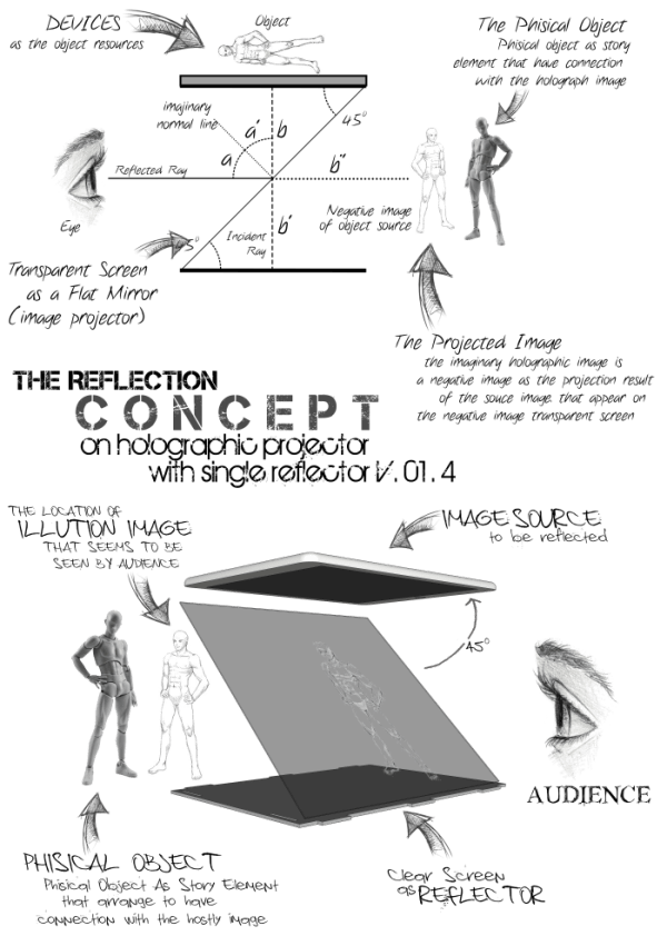- The V.01.4 model is also designed with 2 compartments, which are the illusion mechanism compartment and the holographic projection with the physical object compartment. However, instead of using a flat mirror as the image converter, the V.01.4 model is designed without a mirror element in order to make the mechanism as simple as possible and keep the source image still hidden in the illusion mechanism compartment.