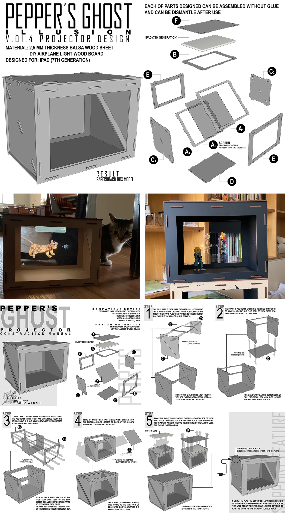 Meanwhile, following the first context that focused on learning how the Pepper Ghost illusion mechanism works, the second context drives the development of V.01.4 prototype design as an interactive learning kit in the form of a simple knock-down kit that is easy to build, a simplified version of the Do-It-Yourself installation, which is suitable to be built by students at different education stages whether individually or in-group and enriches them with experiences in design thinking, hands-on operation, as well as improves their problem-solving skills.